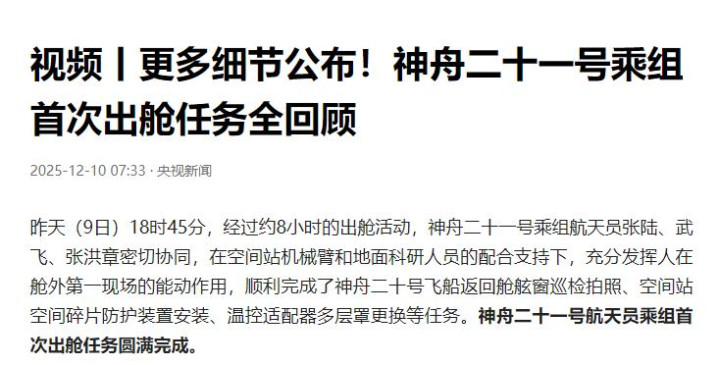直到 12 月9日,神21宇航员出舱完成任务,大家担心的事才终于尘埃落地......