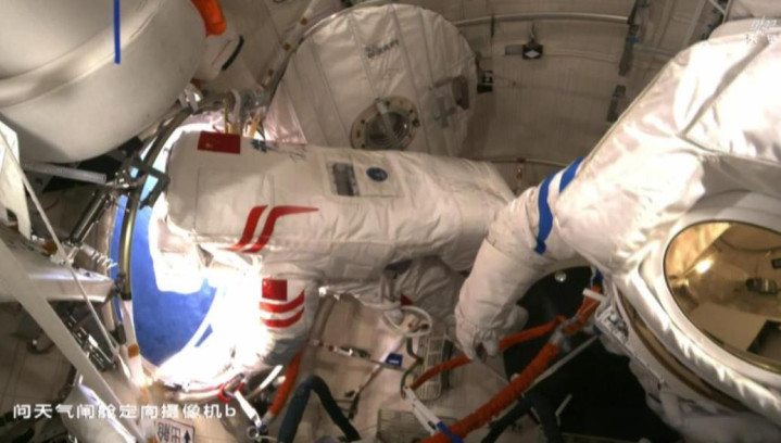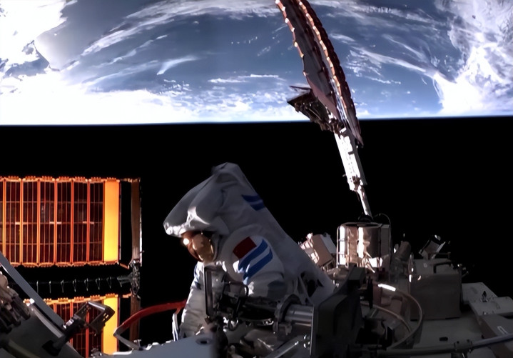 指令长张陆率先出舱,他穿的红色饰带 D 型舱外服是全新装备,时隔两年半第五次漫步太空的他,动作麻利得让人安心。
